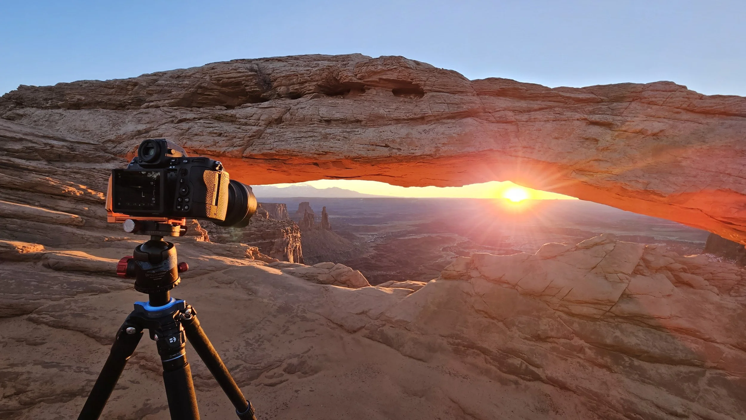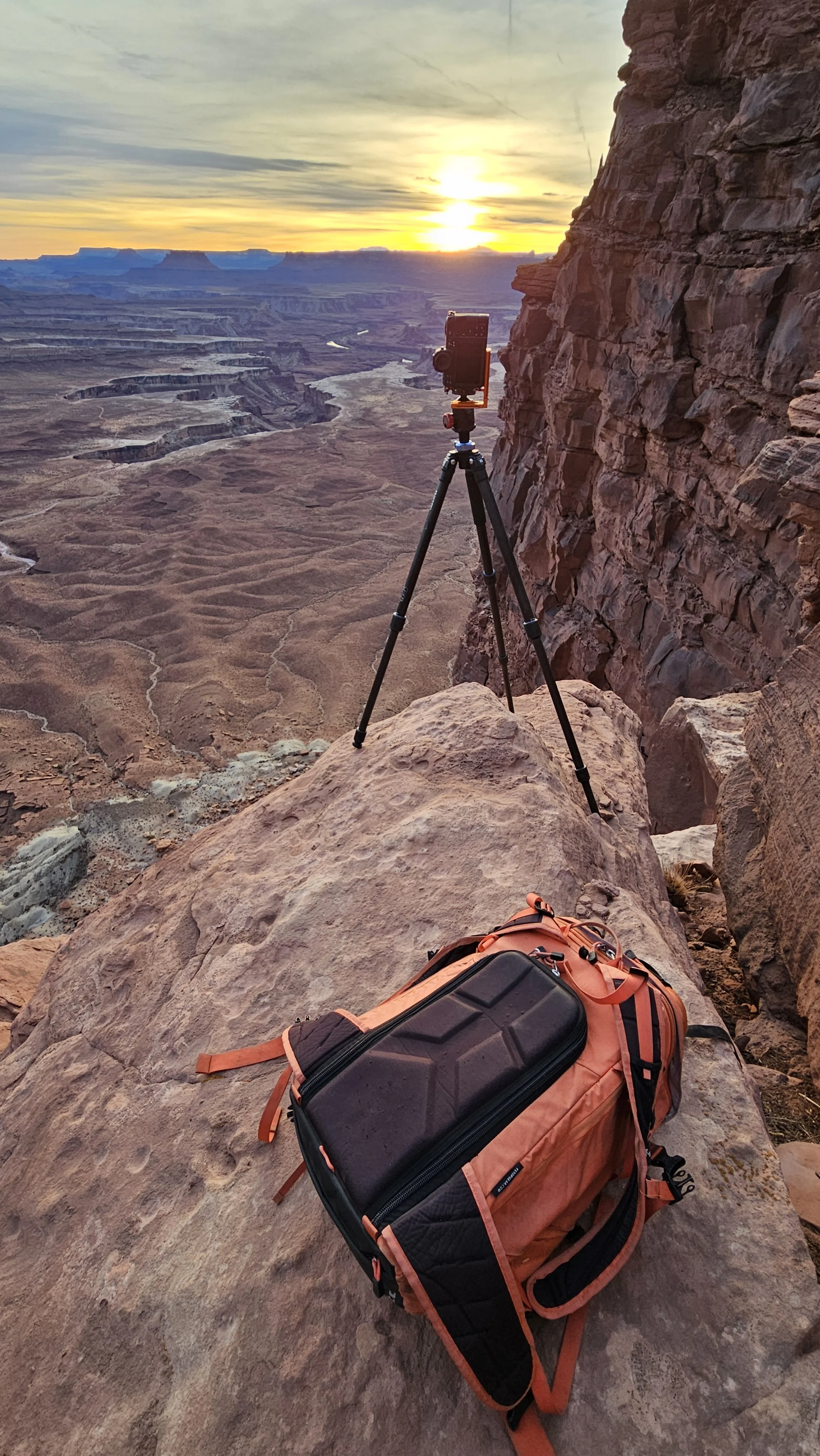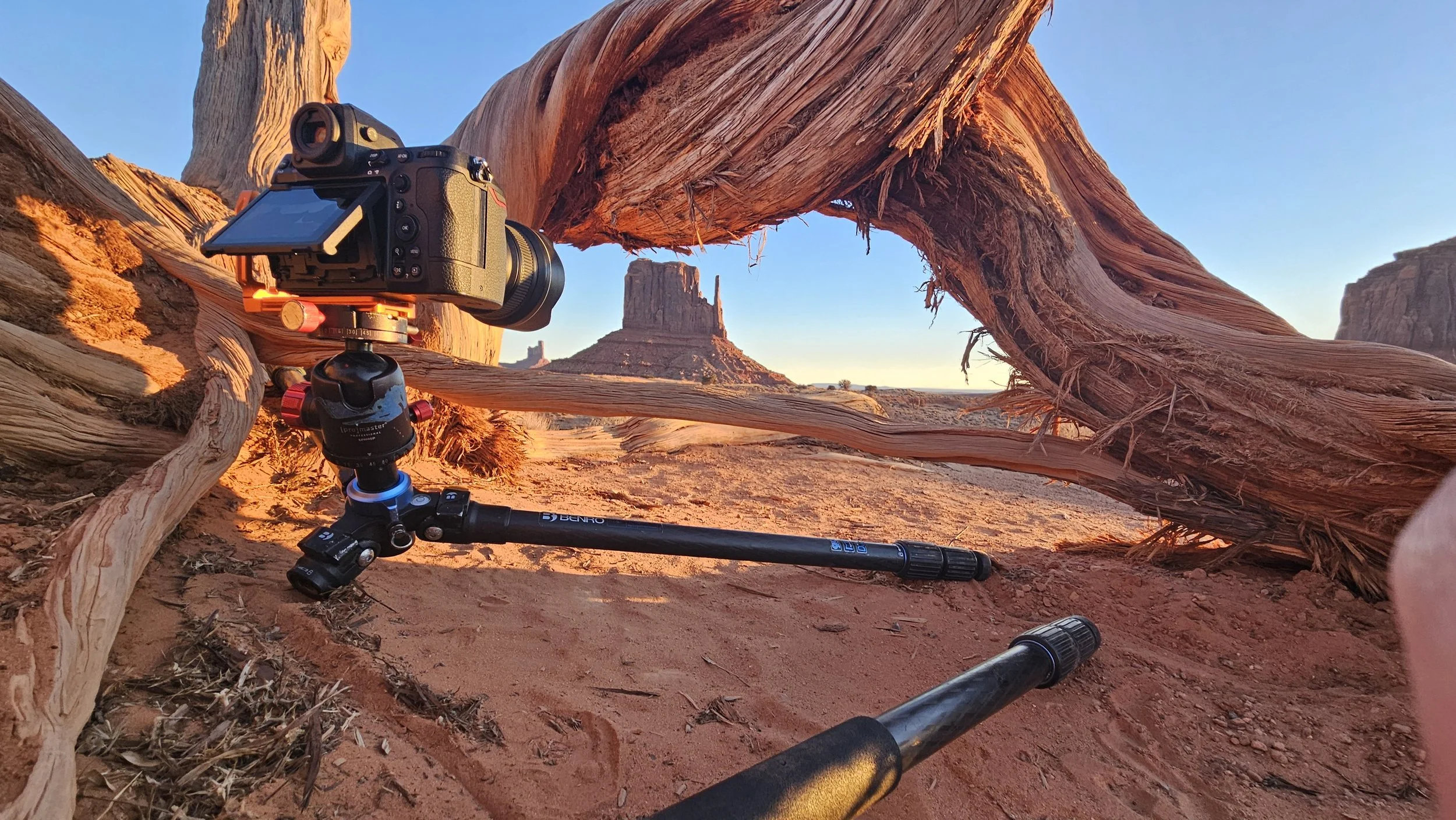 Day three found us in the Monument Valley area. Conditions were great if you were backpacking. 🙄 The morning skies were crystal clear; not what I was hoping for. With no real time to plan, I decided to scout out a location that I wanted to shoot later when conditions were better. I was curious if I could get my camera and tripod into a tight little nook under a tree. Here's a BTS image below.